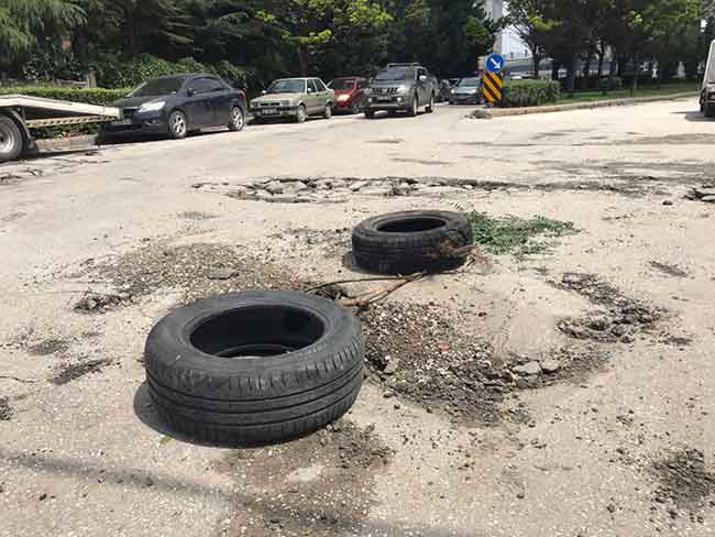 Eskişehir’de dün yaşanan sel sonucunda Küçük Sanayi yollarında oluşan dev çukurlara karşı kendi imkânlarıyla tedbir alan esnaf, yola lastikler koyarak araçların maddi hasar görmesini engellemeye çalışıyor.