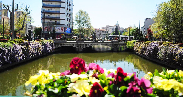 Eskişehir'de doğa, tüm güzelliğiyle göz kamaştırıyor. Pembe renkte çiçekler açan ağaçlar ve Porsuk Nehri'nin kıyısındaki mor renkli asmalar, adeta kartpostallık bir görüntü oluşturuyor.