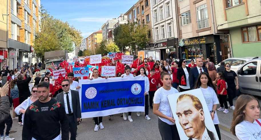 Eskişehir’de 600 ortaokul öğrencisi, Cumhuriyetin 100’üncü yılına özel hazırladıkları dans gösterisini senkronize bir şekilde sergilerken, düzenledikleri kortej ile mahalle halkını da kutlamalara dahil etti.