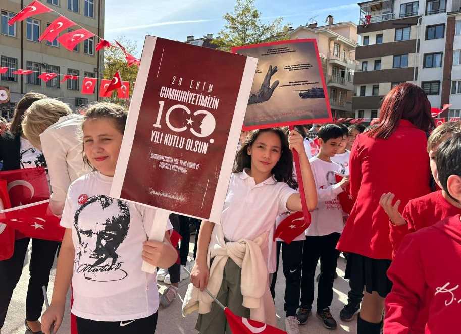 Eskişehir’de 600 ortaokul öğrencisi, Cumhuriyetin 100’üncü yılına özel hazırladıkları dans gösterisini senkronize bir şekilde sergilerken, düzenledikleri kortej ile mahalle halkını da kutlamalara dahil etti.