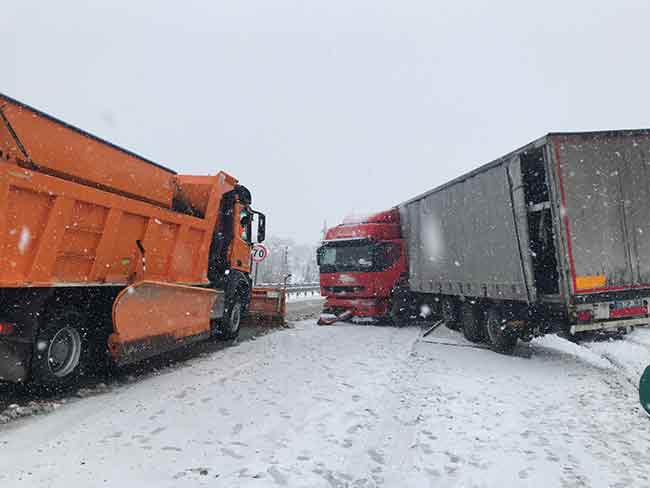 Kütahya-Eskişehir karayolu üzerinde kar yağışının etkisini artırması üzerine bir tırın da karıştığı zincirleme trafik kazası meydana geldi.