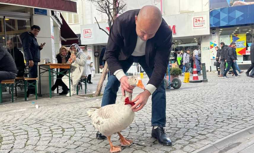 Eskişehir’e 12 yıllık Cango isimli kazı ile gelen Yılmaz Evcenler, kenti dolaştıktan sonra meşhur çi böreğin tadına baktı. Kocaeli’nde yaşayan ve 12 yıldır 'Cango' isimli kazını biran bile yanından ayırmayan Yılmaz Evcenler, Eskişehir’i gezmeye geldi. Kentin turistik yerlerini boynunda papyon takılı kazı ile birlikte gezen Evcenler, insanların yoğun ilgisiyle karşılaştı. Yılmaz Evcenler kazı Cango ile birlikte Çi börek yedi. Çi böreği oldukça beğenen Evcenler ve Cango vatandaşlarla fotoğraf çekindikten sonra şehir turuna devam etti. İşte o görüntüler...