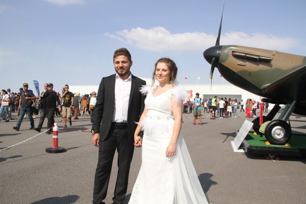 Eskişehir'in Sivrihisar ilçesinde gerçekleştirilen "Sivrihisar Hava Gösterileri 2019"a fotoğraf çekimi için gelen gelin ve damat büyük ilgi gördü.