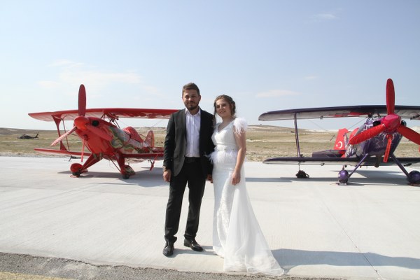 Gürkan, akrobasi uçak gösterilerini çok sevdiğini dile getirerek, "Kendim de uçuşla ilgileniyorum ve bu sektörde çalışıyorum. İleride eşimle birlikte tekrar buraya geldiğimizde bize bir anı kalsın istedik. Hem farklı olsun istedik hem de heyecan katmak istedik. Sevdiğim bir etkinlik ve sevdiğim kadın bugün bir arada. Çok mutluyum" dedi.