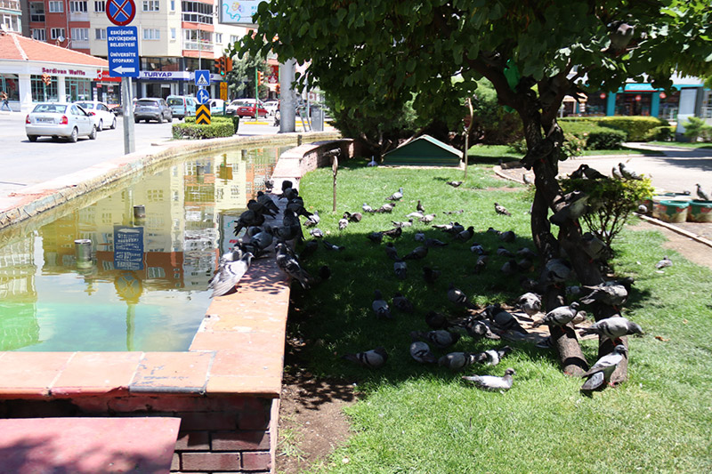Eskişehir’de gün içinde hava sıcaklığının 30 derecenin üzerine çıkmasıyla vatandaşlar ağaç gölgelerine, hayvanlar süs havuzlarına yöneldi.