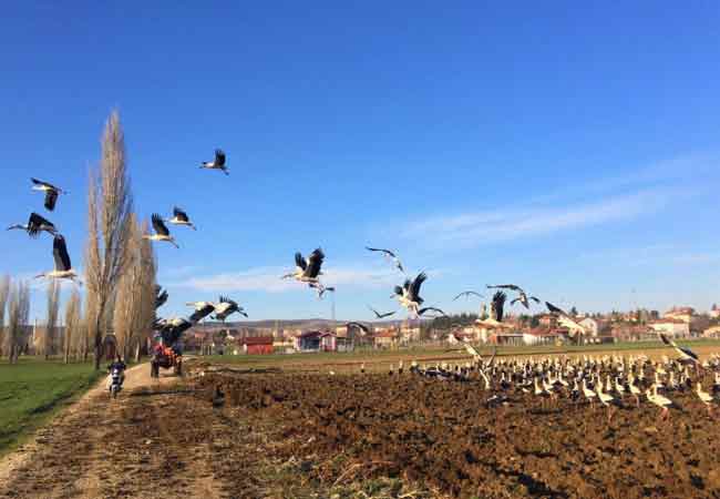 Eskişehir'de bahar mevsiminin müjdecisi olan leylekler, sürü halinde yakından görüntülendi.