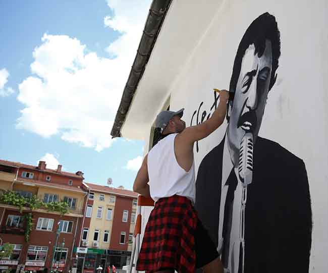 Eskişehir'de 25 yaşındaki ressam Mehmet Ateşli, iş yerlerinin duvarlarına Yeşilçam'ın unutulmaz sanatçılarının resimlerini işliyor.
