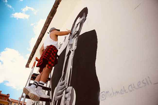 Eskişehir'de 25 yaşındaki ressam Mehmet Ateşli, iş yerlerinin duvarlarına Yeşilçam'ın unutulmaz sanatçılarının resimlerini işliyor.
