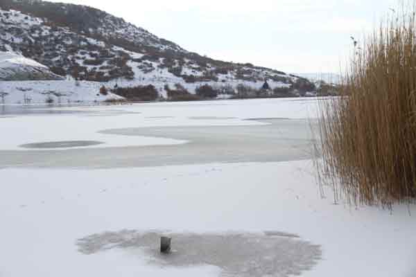 Eskişehir’de soğuk havanın etkisiyle yüzeyinin büyük bölümü buz tutan Sarısungur Göleti kartpostallık fotoğraf kareleri oluşturdu.