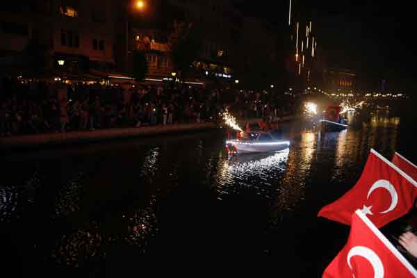 Eskişehir'de, 19 Mayıs Atatürk'ü Anma, Gençlik ve Spor Bayramı dolayısıyla Porsuk Çayı'nda botlarla fener alayı düzenlendi.