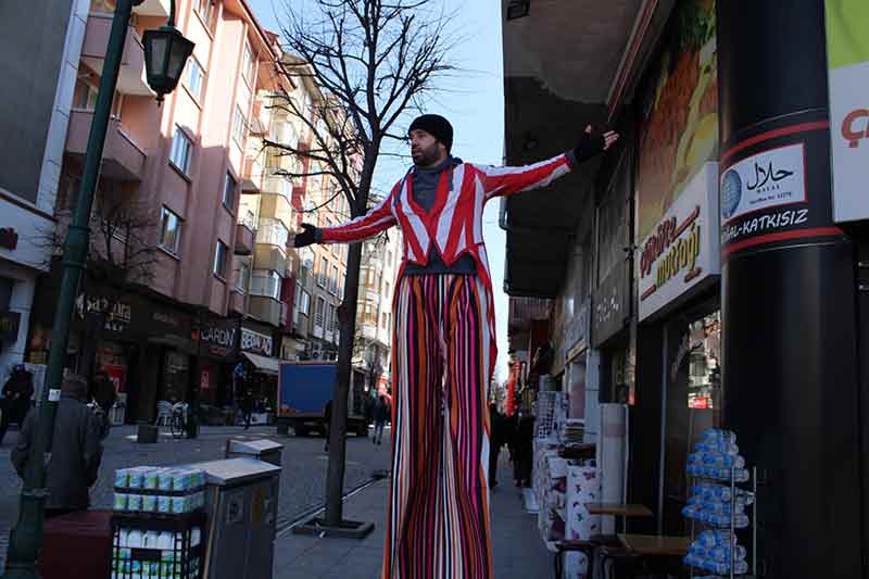 Eskişehir'de Hamamyolu Caddesi’nde tahta bacaklı animatör, esnafın ve çocukların ilgisini üzerinde topladı.