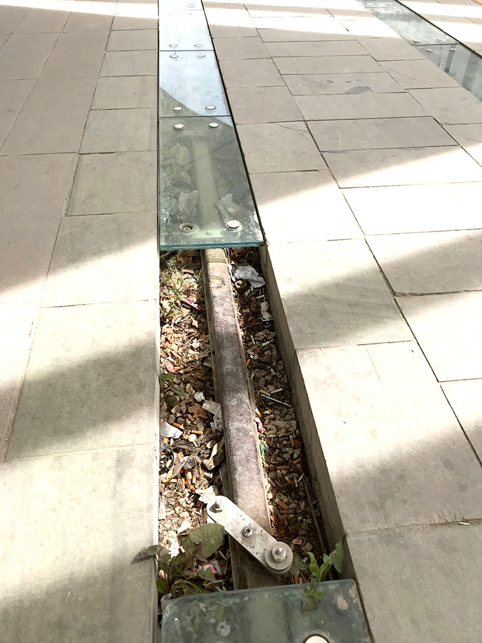 Yere döşenen camlar kırılmış. Her an biri sakatlanabilir. Çimler uzamış, kentin ortasında çayır görüntüsü oluşmuş. Sağa sola saçılan çöpler...
