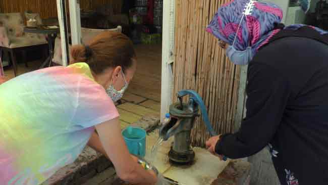 ...Bütün komşularımız bu tulumbayı kullanıyor. Belediyenin yapmış olduğu analizlerde suyun içilebilir olduğu çıkmıştır, ama biz tavsiye etmiyoruz. Çünkü bazen kumlu su çıkıyor. Kuyu 15 metre derinliğinde. Bu su oradan çıkıyor. 15-20 saniye çektiğimizde sıcak suya ulaşıyoruz. Esas sıcak su 9 metredeymiş, ama buraya gelene kadar su sıcaklığını kaybediyor...