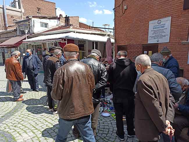Eskişehir’de sokak ortasında kurulan ikinci el eşya tezgâhında maskesiz satıcılar ve sosyal mesafe kuralına uymayan müşteriler dikkat çekti.