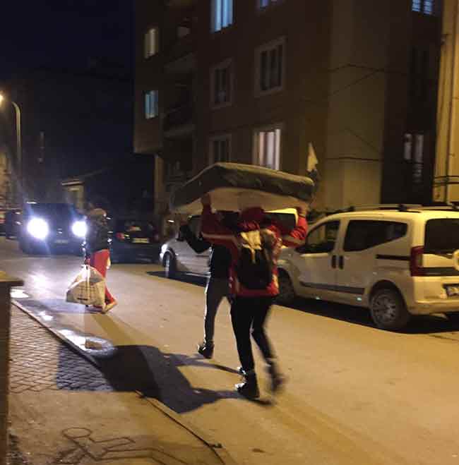 İki üniversite öğrencisi, sokak ortasında yürüyerek aldıkları baza yatağını kafalarının üstünde taşıdı