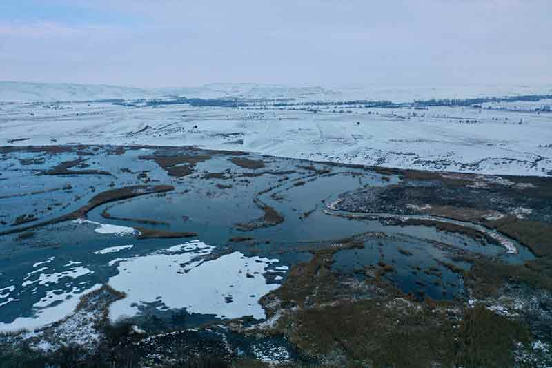 "Doğal Sit-Nitelikli Doğal Koruma Alanı" olarak tescil edilen, yüzlerce kuş türüne konaklama, beslenme ve üreme olanağı sağlayan Eskişehir'deki Balıkdamı, kar yağışlarıyla beyaza büründü