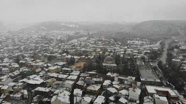 Eskişehir’de sabah saatlerinde başlayan kar yağışı, tarihi Odunpazarı Bölgesi’nde bulunan dükkân ve evlerin çatılarını beyaza bürüdü. Kartpostallık manzara drone ile havadan görüntülendi.