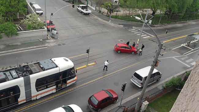 Eskişehir’de tramvay hattı üzerinde bulunan ve çevresinde hiçbir yükselti veya uyarı bulunmayan direk, sık sık trafik kazasına sebep oluyor.