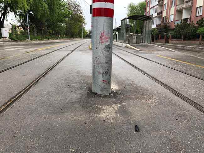 Eskişehir’de tramvay hattı üzerinde bulunan ve çevresinde hiçbir yükselti veya uyarı bulunmayan direk, sık sık trafik kazasına sebep oluyor.