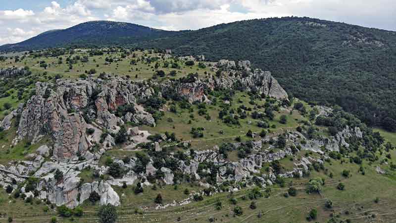 Eskişehir’de bulunan Yazılıkaya/Midas Anıtı ve bulunduğu plato, büründüğü doğal yeşilliği ile havadan görüntülendi.
