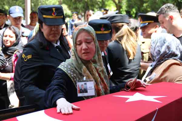 Şehidin eşi Pembegül Arduç ise “Ağlamak yok, dik duracağım” diyerek tabuta sarıldı. Öte yandan törene katılan çok sayıda vatandaş, “Şehitler ölmez vatan bölünmez, kahrolsun PKK” sloganları attı.