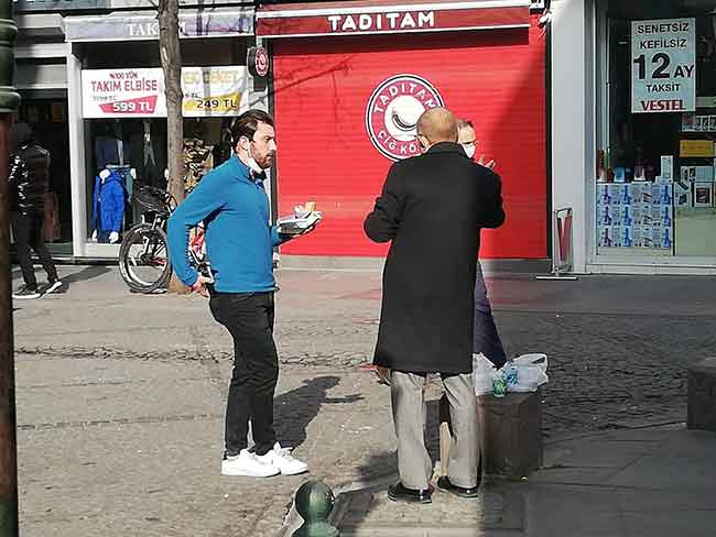 Eskişehir ve Türkiye'de uygulanmaya başlanan yeni koronavirüs tedbirleri kapsamında, restoran, lokanta, pastane, kafe, kafeterya gibi yeme içme yerleri paket servis haricinde hizmet veremeyince vatandaşlar karınlarını sokak köşelerinde doyurmaya başladı.