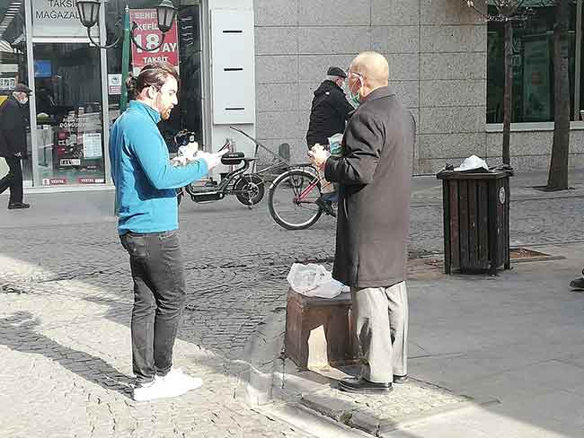 Eskişehir ve Türkiye'de uygulanmaya başlanan yeni koronavirüs tedbirleri kapsamında, restoran, lokanta, pastane, kafe, kafeterya gibi yeme içme yerleri paket servis haricinde hizmet veremeyince vatandaşlar karınlarını sokak köşelerinde doyurmaya başladı.