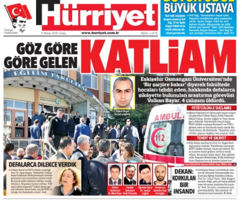Osmangazi Üniversitesi’ndeki üçü akademisyen dört kişinin ölümüyle sonuçlanan saldırı, yaygın gazetelerde geniş yer buldu. Pek çok gazete üzücü olayı manşet ya da sürmanşetinden duyurdu. Sözcü “Üniversitedeki FETÖ kavgası katliam getirdi” manşetiyle olayı okurlarına duyururken Hürriyet “Göz göre göre gelen katliam” başlığını kullandı. Cumhuriyet “Akademide katliam”, Vatan “Kampüste katliam”, Posta “Dört canın hesabını kim verecek”, Habertürk “Fakültede katliam”, Takvim “Akademik dehşet” başlığıyla duyurdu.