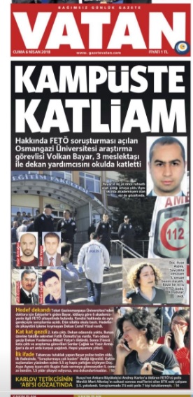 Osmangazi Üniversitesi’ndeki üçü akademisyen dört kişinin ölümüyle sonuçlanan saldırı, yaygın gazetelerde geniş yer buldu. Pek çok gazete üzücü olayı manşet ya da sürmanşetinden duyurdu. Sözcü “Üniversitedeki FETÖ kavgası katliam getirdi” manşetiyle olayı okurlarına duyururken Hürriyet “Göz göre göre gelen katliam” başlığını kullandı. Cumhuriyet “Akademide katliam”, Vatan “Kampüste katliam”, Posta “Dört canın hesabını kim verecek”, Habertürk “Fakültede katliam”, Takvim “Akademik dehşet” başlığıyla duyurdu.