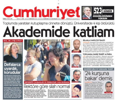 Osmangazi Üniversitesi’ndeki üçü akademisyen dört kişinin ölümüyle sonuçlanan saldırı, yaygın gazetelerde geniş yer buldu. Pek çok gazete üzücü olayı manşet ya da sürmanşetinden duyurdu. Sözcü “Üniversitedeki FETÖ kavgası katliam getirdi” manşetiyle olayı okurlarına duyururken Hürriyet “Göz göre göre gelen katliam” başlığını kullandı. Cumhuriyet “Akademide katliam”, Vatan “Kampüste katliam”, Posta “Dört canın hesabını kim verecek”, Habertürk “Fakültede katliam”, Takvim “Akademik dehşet” başlığıyla duyurdu.