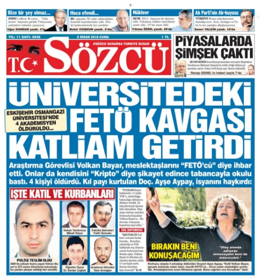 Osmangazi Üniversitesi’ndeki üçü akademisyen dört kişinin ölümüyle sonuçlanan saldırı, yaygın gazetelerde geniş yer buldu. Pek çok gazete üzücü olayı manşet ya da sürmanşetinden duyurdu. Sözcü “Üniversitedeki FETÖ kavgası katliam getirdi” manşetiyle olayı okurlarına duyururken Hürriyet “Göz göre göre gelen katliam” başlığını kullandı. Cumhuriyet “Akademide katliam”, Vatan “Kampüste katliam”, Posta “Dört canın hesabını kim verecek”, Habertürk “Fakültede katliam”, Takvim “Akademik dehşet” başlığıyla duyurdu.