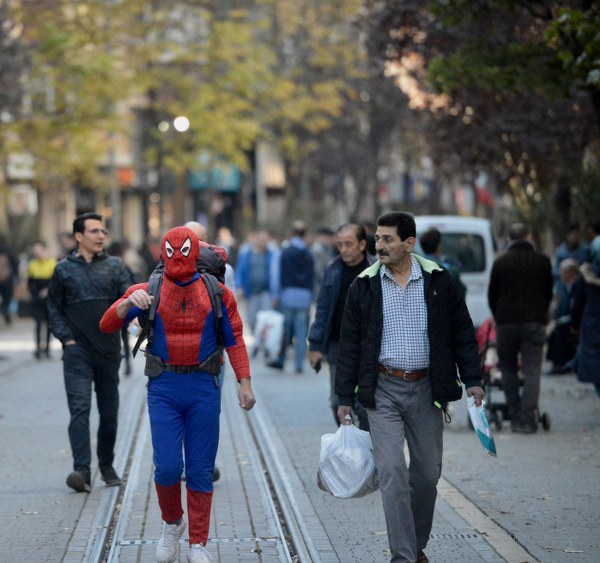Eskişehir'de Örümcek Adam kostümüyle yaklaşık 5 yıldır yüksek katlı binaların dış cephe temizliği yapan ve tabelalarını asan Tamer Uysal, Mehmetçiğe destek amacıyla bir apartmanın dış cephesinde Türk bayrağı açtı, asker selamı verdi