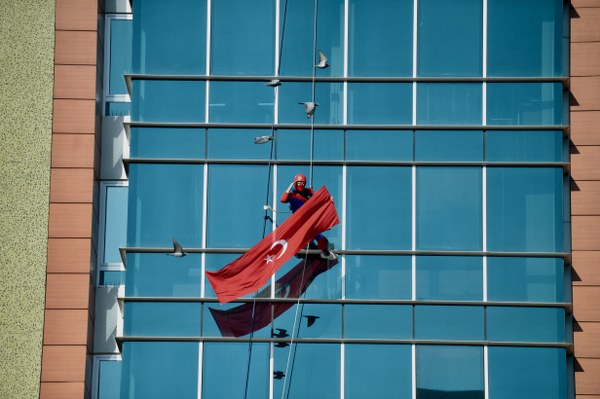 Eskişehir'de Örümcek Adam kostümüyle yaklaşık 5 yıldır yüksek katlı binaların dış cephe temizliği yapan ve tabelalarını asan Tamer Uysal, Mehmetçiğe destek amacıyla bir apartmanın dış cephesinde Türk bayrağı açtı, asker selamı verdi