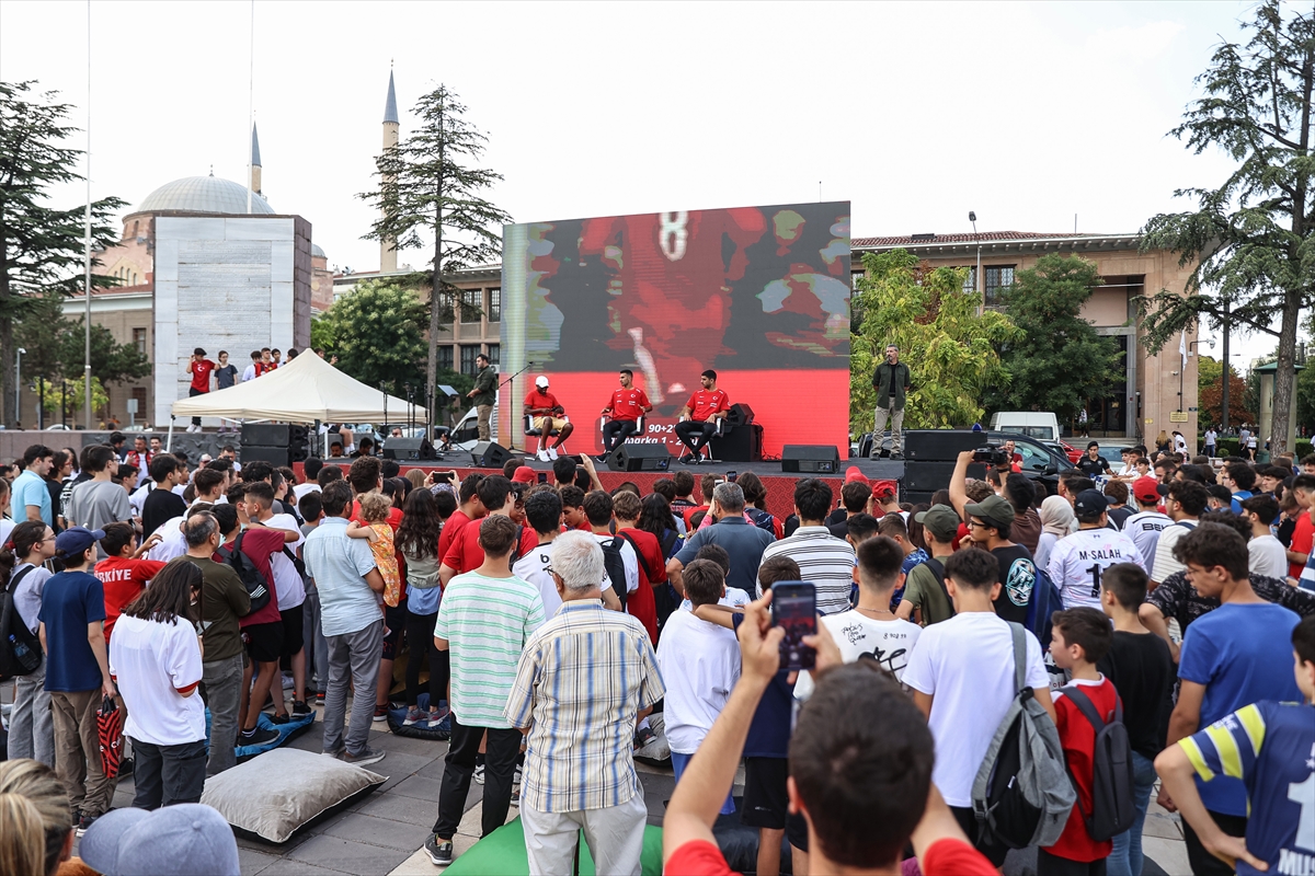 Türkiye Futbol Federasyonu (TFF) Başkanı Mehmet Büyükekşi ile milli futbolcular Zeki Çelik ve Cenk Özkacar, A Milli Takım'ın UEFA 2024 Avrupa Şampiyonası Elemeleri D Grubu'nda yarın Ermenistan ile yapacağı maç öncesi kurulan "fan zone"da (taraftar alanı), taraftarlarla buluştu.