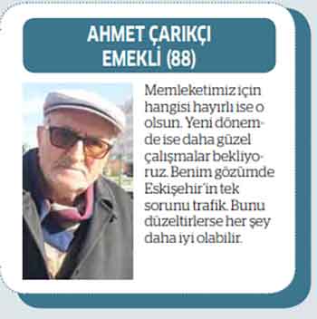 Ahmet Çarıkçı Emekli (88) "Memleketimiz için hangisi hayırlı ise o olsun. Yeni dönemde ise daha güzel çalışmalar bekliyoruz. Benim gözümde Eskişehir’in tek sorunu trafik. Bunu düzeltirlerse her şey daha iyi olabilir."