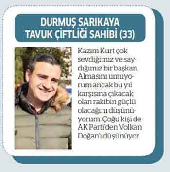 DurmuŞ Sarıkaya Tavuk Çiftliği Sahibi (33) "Kazım Kurt çok sevdiğimiz ve saydığımız bir başkan. Almasını umuyorum ancak bu yıl karşısına çıkacak olan rakibin güçlü olacağını düşünüyorum. Çoğu kişi de AK Parti’den Volkan Doğan’ı düşünüyor."