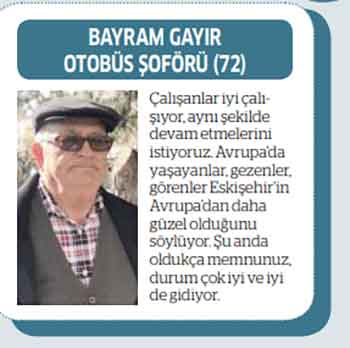 Bayram Gayır Otobüs Şoförü (72) "Çalışanlar iyi çalışıyor, aynı şekilde devam etmelerini istiyoruz. Avrupa’da yaşayanlar, gezenler, görenler Eskişehir’in Avrupa’dan daha güzel olduğunu söylüyor. Şu anda oldukça memnunuz, durum çok iyi ve iyi de gidiyor."