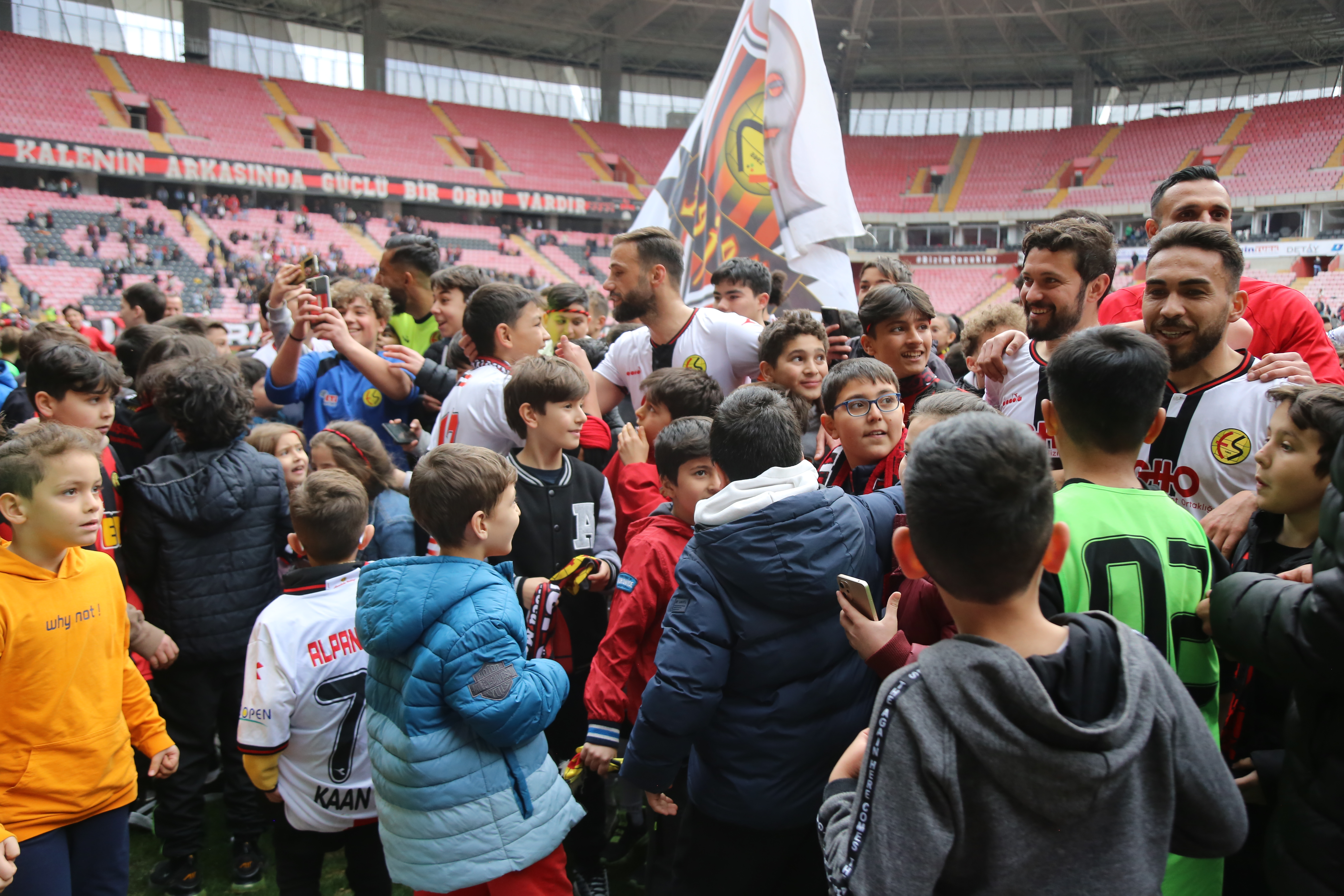 Eskişehirspor'un Kaynaşlı Belediyespor'u 2-1 mağlup ettiği maçın ardından, stadyumda unutulmaz görüntüler yaşandı. Emniyet güçlerinin izniyle sahaya giren çocuklar, Eskişehirsporlu futbolcularla birlikte galibiyeti coşkuyla kutladı. Maçta dikkat çeken bir detay ise çocuk taraftarların fazlalığıydı. Havanın güzel olmasının yanı sıra Fabrika Futbol Okulu'ndan gelen minik futbolcular da maçı heyecanla izledi. Maçın bitiş düdüğünün ardından sahaya koşan çocuklar, Eskişehirsporlu futbolcularla birlikte sevinçlerini paylaştı. Eskişehirspor Başkanı Erkan Koca da bu güzel görüntülerden duyduğu mutluluğu dile getirdi. Koca, "Bugün maç sonunda yüzlerce Eskişehirspor formalı çocuğumuzun sahaya girip futbolcularımızla beraber tribünlerle sevinmesi her birimizi hem duygulandıran hem de umutlandıran görüntülerdi. Çocuklarımızın sahaya girmesini sağlayan Eskişehir Emniyet Teşkilatımıza teşekkür ederiz." dedi.