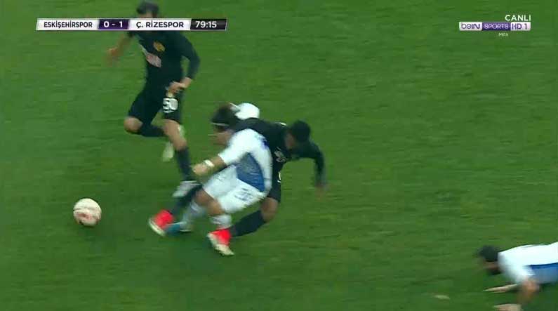 Ofoedu’nun topu hakim olma düşüncesiyle Recep Niyaz’a yaptığı müdahalede rakip oyuncu yerde kaldı.