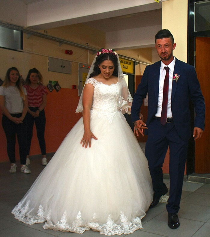 Eskişehir'de 4 yıl önce imkansızlıklar nedeniyle düğün yapamadan evlenen Safiye ve Hasan Ertogan çifti, bir meslek lisesinin öğretmenleri ve öğrencileri tarafından organize edilen düğünle hayallerine kavuştu.