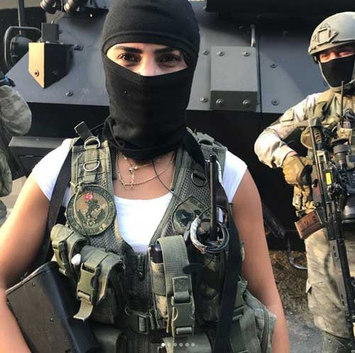 Operasyona katılan askerleri ziyaret eden ve kamuflaja benzer pantolonu ile dikkat çeken Sabriye Şengül, çelik yelek giydi, silah kuşandı.