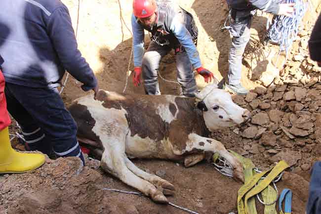 Eskişehir’de, lületaşı maden ocaklarının bulunduğu bölgede otlayan buzağı, toprak kayması sonucu 10 metrelik kuyuya düştü. Durumu fark eden çobanın hayvan sahiplerine haber vermesinin ardından bölgede adeta filmlere konu olacak kurtarma operasyonu başlatıldı. Yaklaşık 6 saatlik hummalı çalışma sonucunda mutlu sona ulaşılarak, buzağı düştüğü kuyudan çıkarıldı.