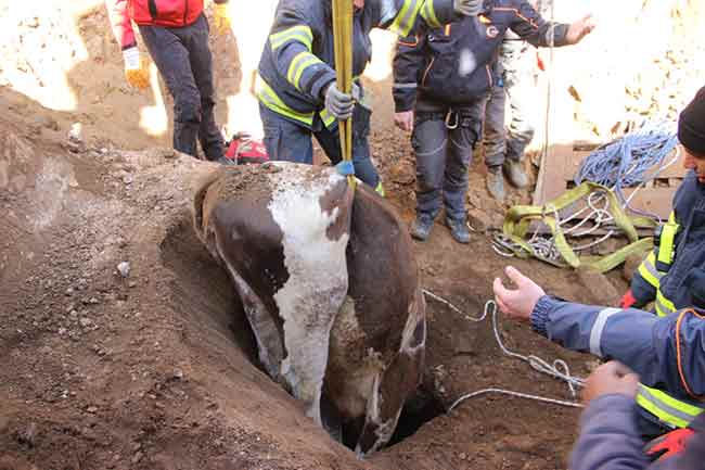 Eskişehir’de, lületaşı maden ocaklarının bulunduğu bölgede otlayan buzağı, toprak kayması sonucu 10 metrelik kuyuya düştü. Durumu fark eden çobanın hayvan sahiplerine haber vermesinin ardından bölgede adeta filmlere konu olacak kurtarma operasyonu başlatıldı. Yaklaşık 6 saatlik hummalı çalışma sonucunda mutlu sona ulaşılarak, buzağı düştüğü kuyudan çıkarıldı.