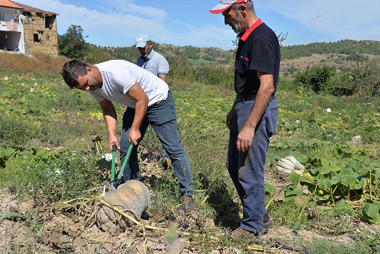 Bilecik merkeze bağlı 360 rakımlı Kızıldamlar köyünde yetiştirilen ve raf ömrü bir sene olan kestane kabağının tarladan toplanmadan büyük bölümü satıldı.