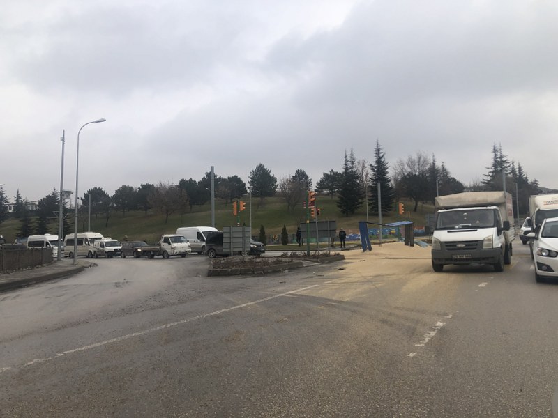 Eskişehir’de virajı alamayarak devrilen traktörün römorku metrelerce sürüklenirken, içinde bulunan yüzlerce kilo hayvan yemi karayoluna yayıldı, trafik bir süre aksadı.