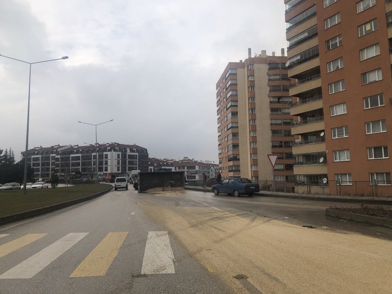 Eskişehir’de virajı alamayarak devrilen traktörün römorku metrelerce sürüklenirken, içinde bulunan yüzlerce kilo hayvan yemi karayoluna yayıldı, trafik bir süre aksadı.