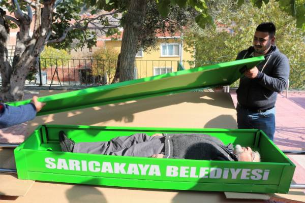 Eskişehir Sarıcakaya İlçe Belediye Başkanlığı tarafından 'Sosyal Sorumluluk Projesi' kapsamında 20 camiye hediye edilen tabutların teslimi sırasında cami cemaati Mustafa Suna’nın tabutun içine girerek sağlamlığını denemesi görenleri şaşırttı.