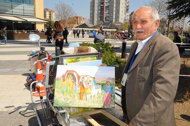 Eskişehir’de yaşayan 83 yaşındaki Ahmet Er, ilkokulda kum üzerine çizerek başladığı resim sanatını 70 yıldır sürdürüyor ve eserlerini motosikleti ile köy köy dolaşarak sergiliyor.
