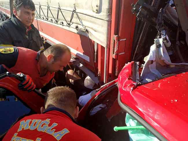 Muğla’da kamyon dorsesinin altına giren otomobilin tavan bölümü tamamen yok olurken, araçta bulunan iki kişi kazayı yaralı olarak atlattı.