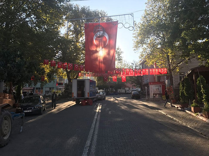 Bilecik'in İnhisar ilçesinde aklı dengesi yerinden olmayan bir şahıs tarafından yakılan 3 Türk bayrağı sonrası ilçe Türk Bayrakları ile donatıldı. Bayrakları yakılan 3 kahveci yerlerine yenilerini astılar.